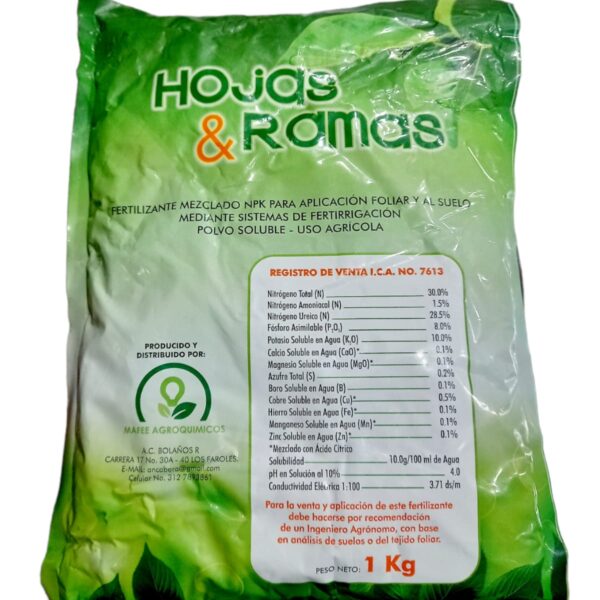 | Description | Nutrifoliar es un fertilizante que permite el completo desarrollo de las plantas y previene la caída prematura de flores y frutos. | HOJAS & RAMAS fertilizante mezclado NPK para aplicación foliar y al suelo mediante sistemas de fertilizacion polvo soluble. | MA-KOLLE es un fertilizante mezclado compuesto NPK, para aplicación al suelo, mediante sistema de fertirriego. | Intrepid SC es un insecticida con gran eficacia controlando larvas de los lepidópteros, acelerando su proceso de muda deteniendo el daño, y además presenta acción ovicida. Es completamente selectivo y posee una muy baja toxicidad y ecotoxicidad. | Herbicida sistémico que ofrece un mejor efecto de quemado y control comparado con las aminas existentes en el mercado, además de una alta selectividad al pasto. | |