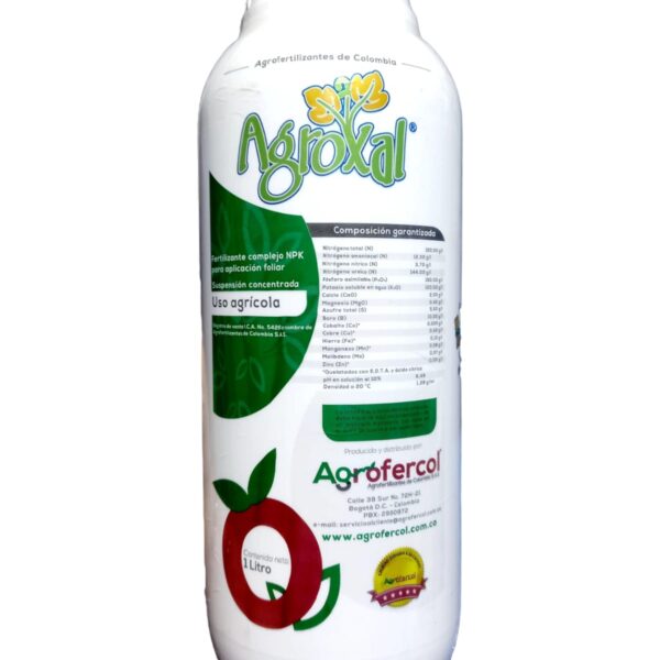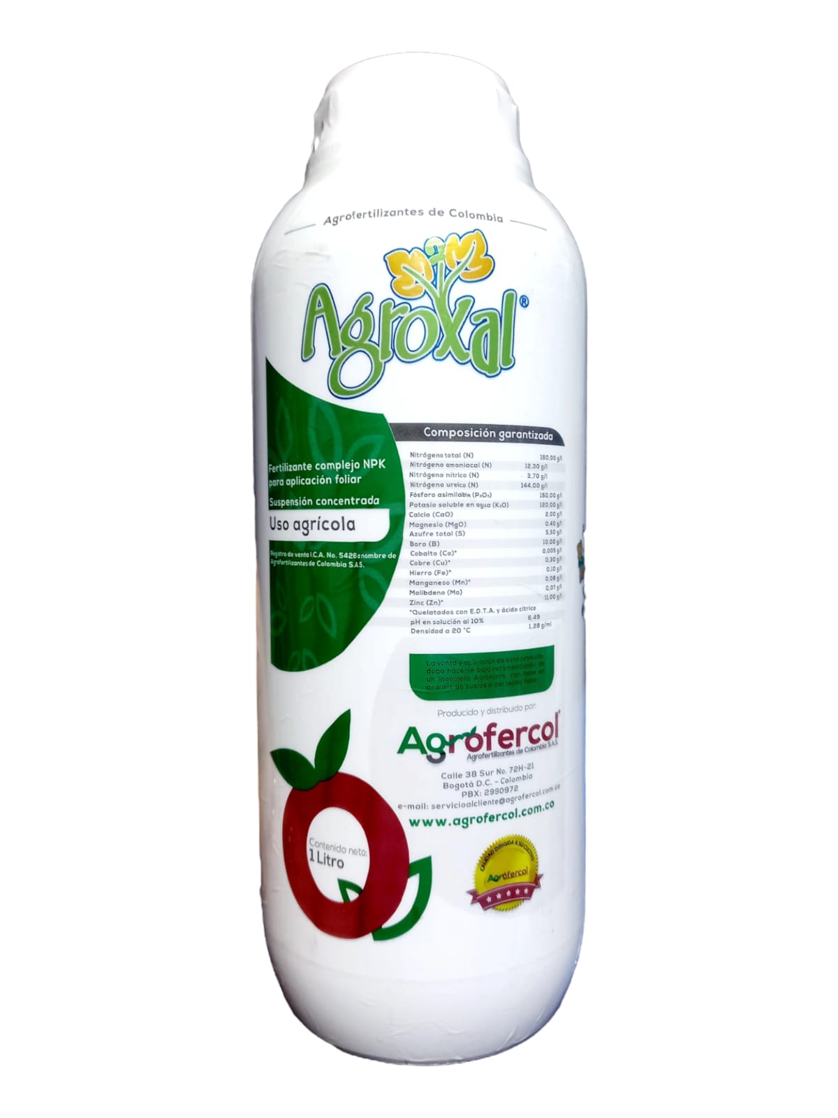 AGROXAL es un complemento nutricional, que además de aportar N.P.K provee elementos secundarios y menores acompañados de agentes quelatantes que permiten el desarrollo integral de las plantas. Es un fertilizante completo que puede aplicarse tanto en etapa