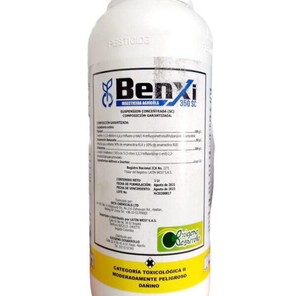 BENXI 350 SC, es un insecticida que combina tres eficientes ingredientes activos ( Piretoide, Fenolpirazol y Avermectina), capaces de controlar un amplio rango de plagas en estado adulto e inmaduro, con bajo riesgo de resistencia, actua por contacto e ing