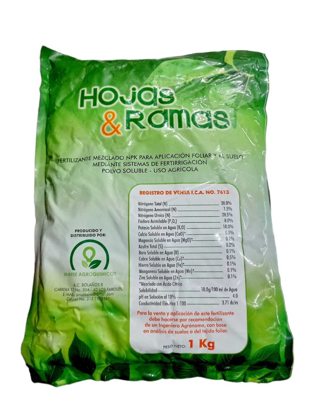 HOJAS & RAMAS fertilizante mezclado NPK para aplicación foliar y al suelo mediante sistemas de fertilizacion polvo soluble.