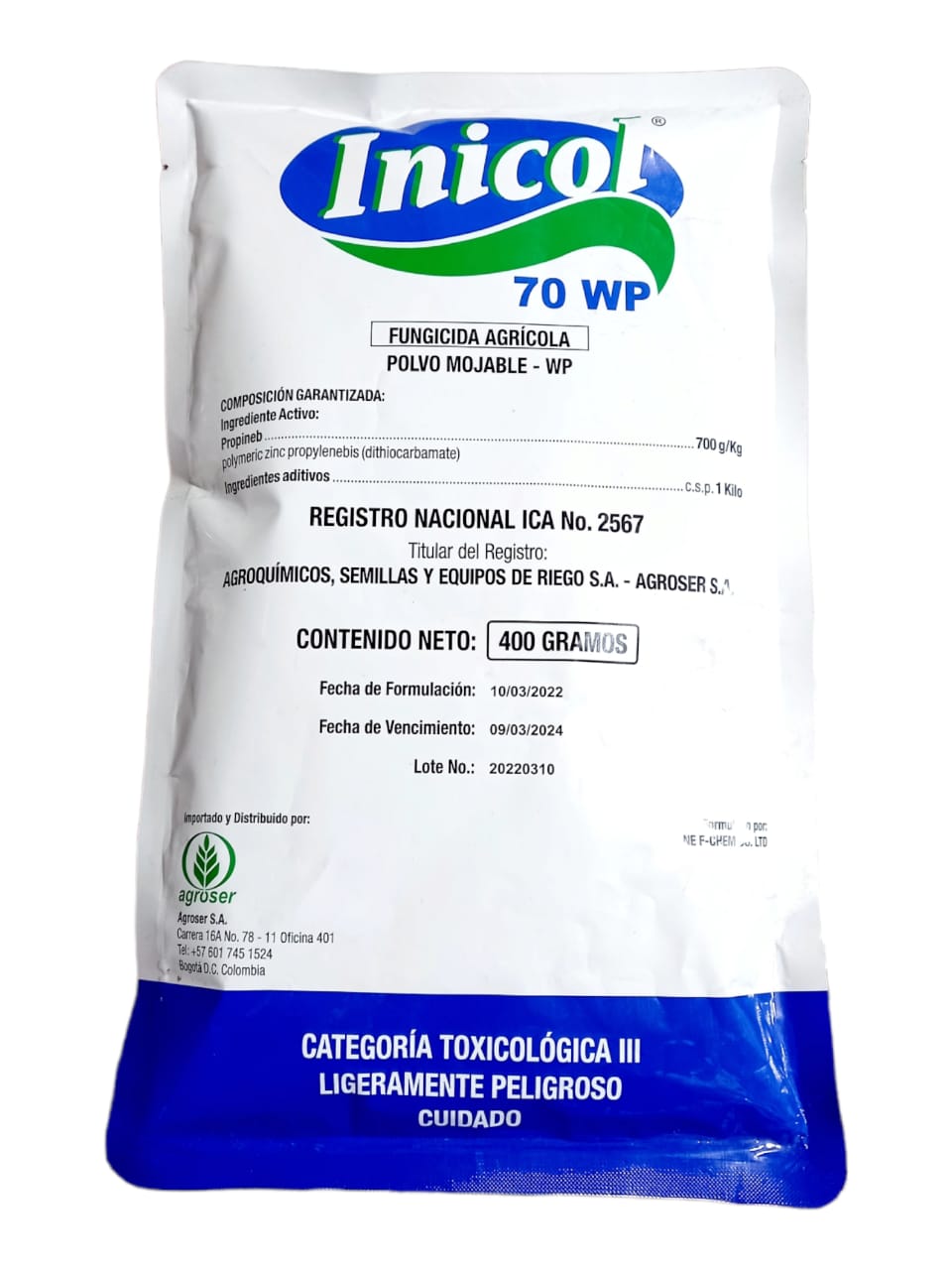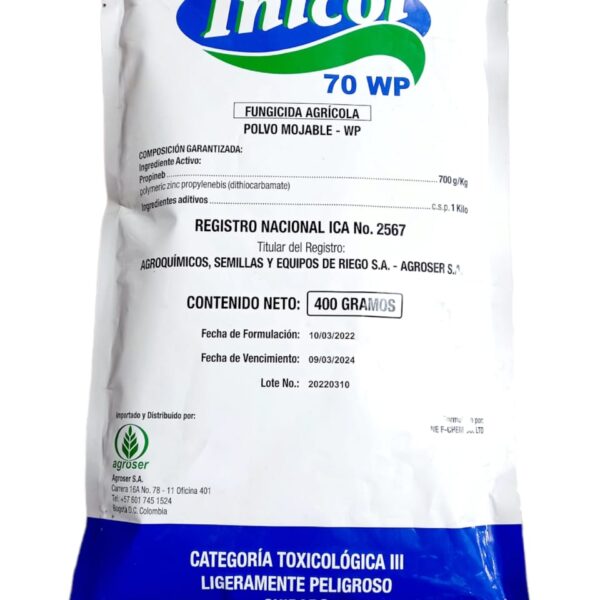 INICOL 70WP es un fungicida perteneciente al grupo de los carbamatos. Con acción preventiva, es un fungicida clasificado con acción multisitio según la FRAC(M3),con amplia acción residual.