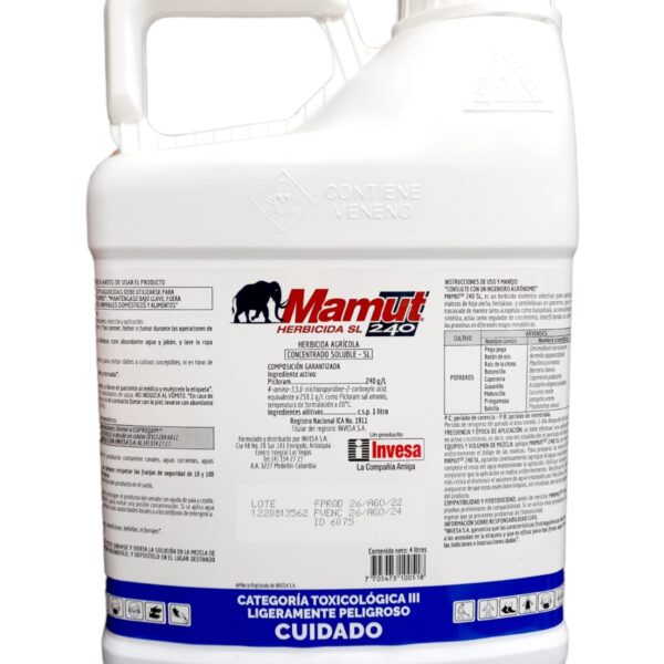 MAMUT 240 SL, Es un herbicida sistemico selectivo para aplicación post-emergente, indicado para el control de malezas de hoja ancha, herbacea y semileñosas en potreros, es rapidamente absorbido por raices y hojas.