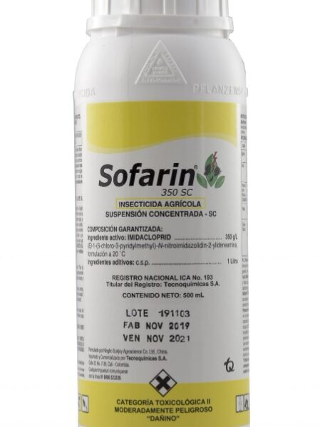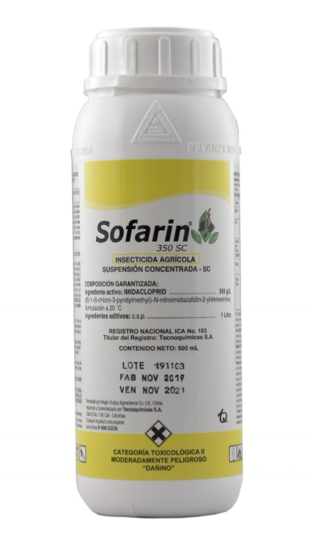 SOFARIN 350 SC, insecticida cloronicotínico que actúa por contacto e ingestión para el control de insectos homópteros, dípteros, coleópteros y tisanópteros en los cultivos de flores, rosas, papa, arroz, hortalizas y tomate.