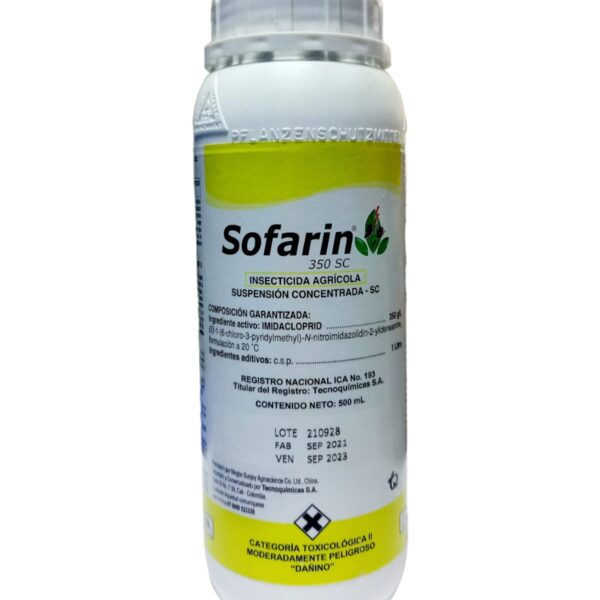 SOFARIN 350 SC, insecticida cloronicotínico que actúa por contacto e ingestión para el control de insectos homópteros, dípteros, coleópteros y tisanópteros en los cultivos de flores, rosas, papa, arroz, hortalizas y tomate.